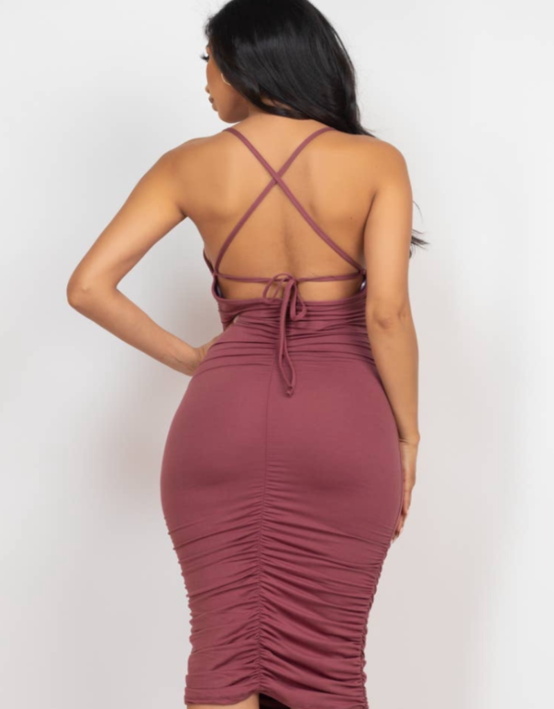 • RUCHED CRISSCROSS BACK SEXY DRESS